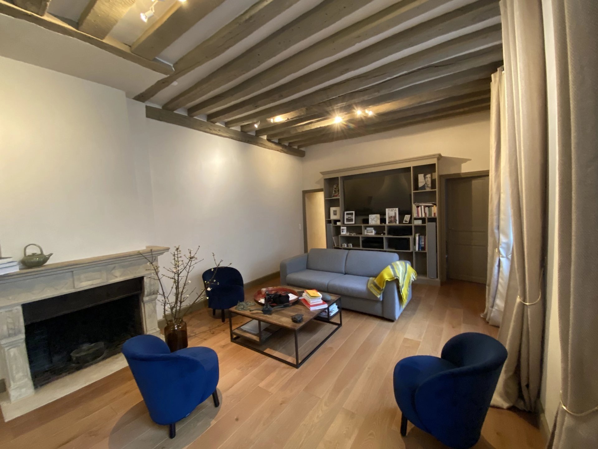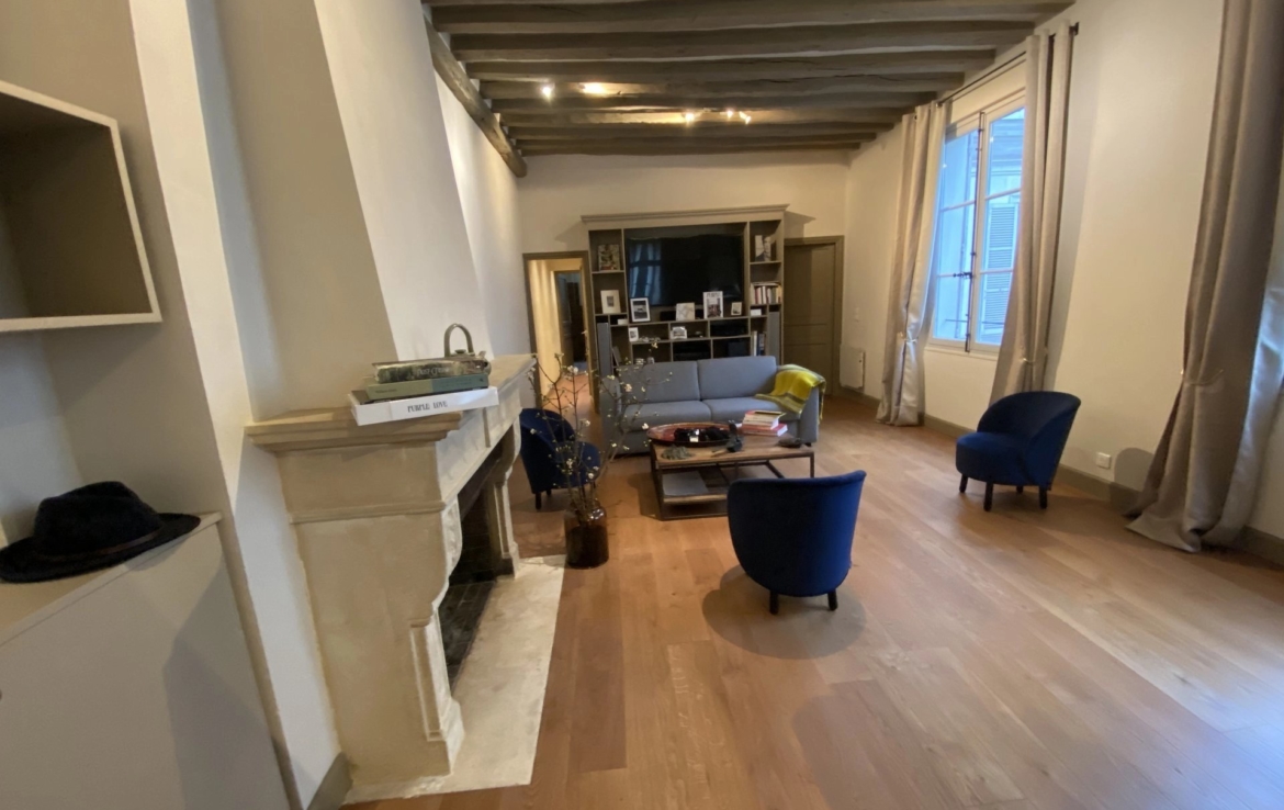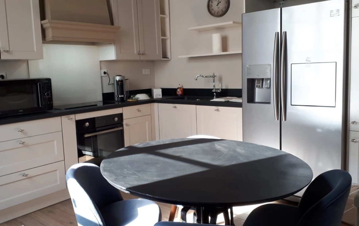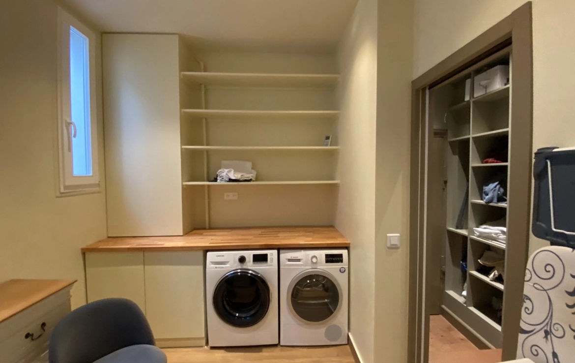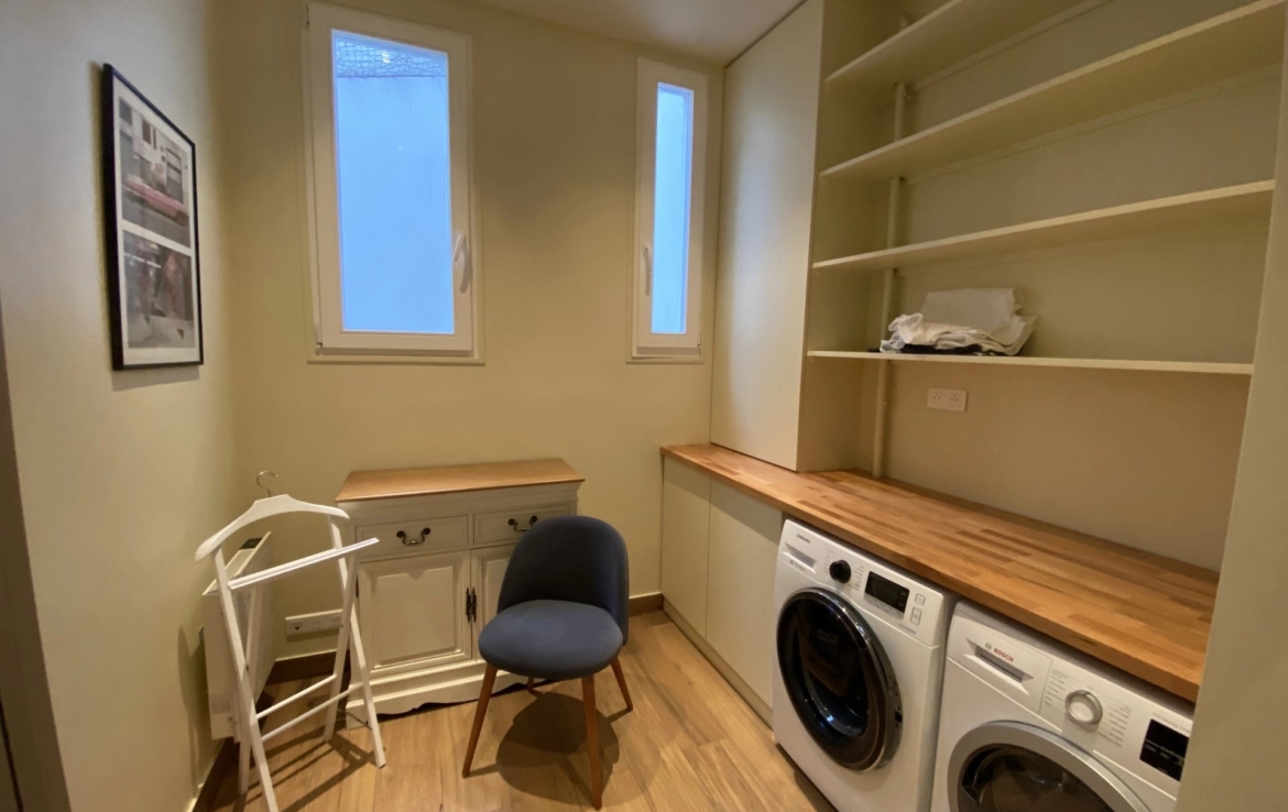 Le mobilier est de grande qualité (électroménager de grandes marques, équipement audio/vidéo, système Sonos, écran Samsung 165 cm, 64 pouces). Il comprend une entrée par le très bel escalier d’honneur et une autre par l’escalier de l’immeuble de fond de cour.