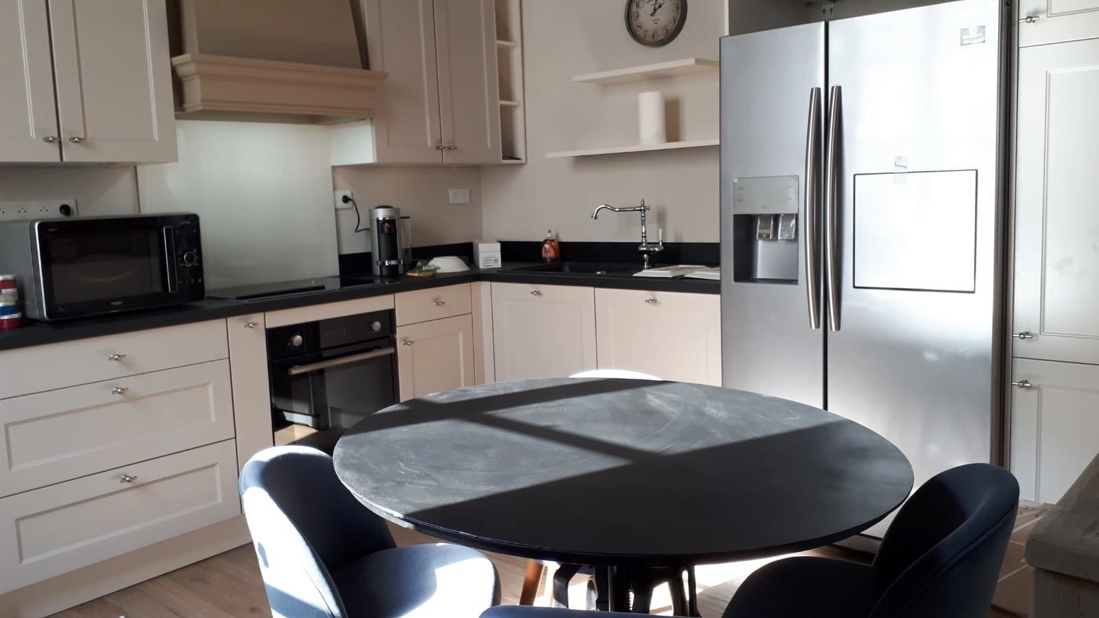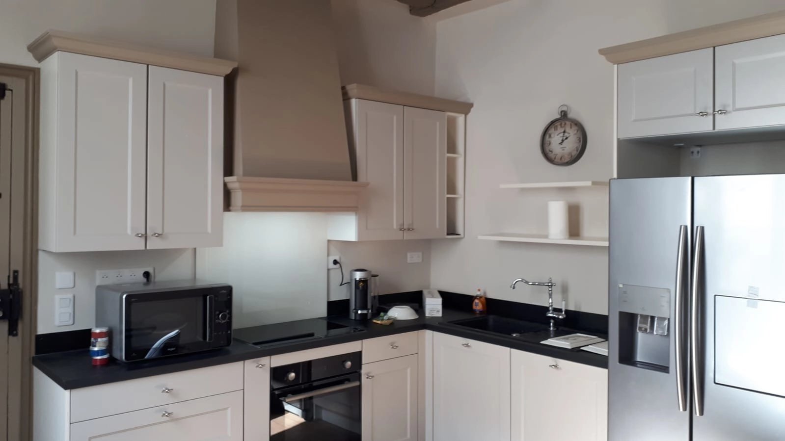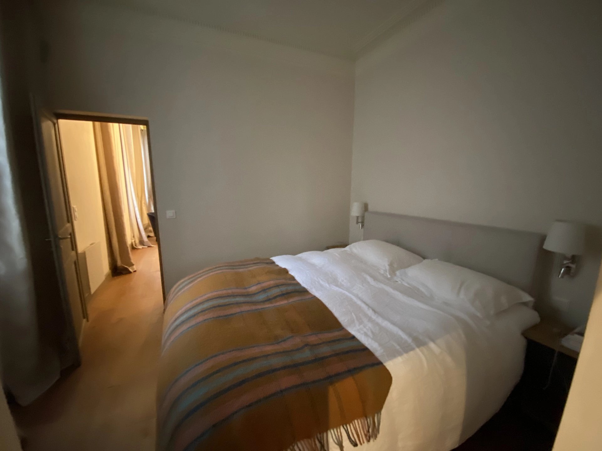 Le mobilier est de grande qualité (électroménager de grandes marques, équipement audio/vidéo, système Sonos, écran Samsung 165 cm, 64 pouces). Il comprend une entrée par le très bel escalier d’honneur et une autre par l’escalier de l’immeuble de fond de cour.