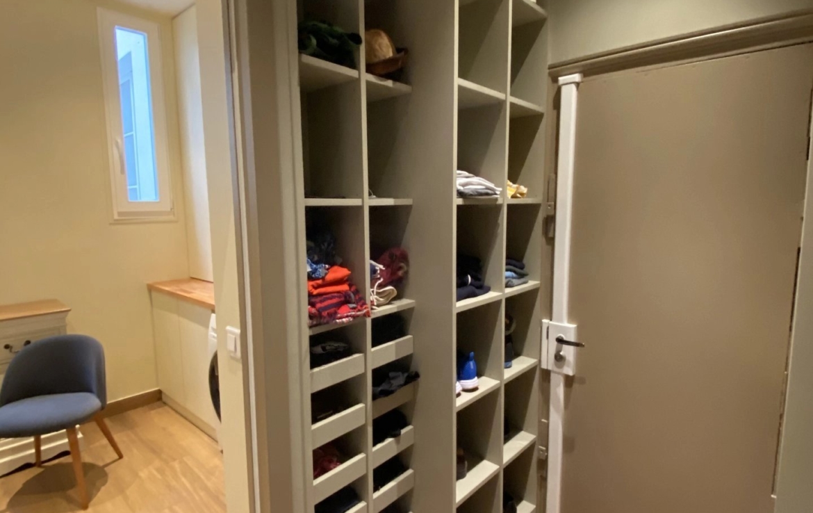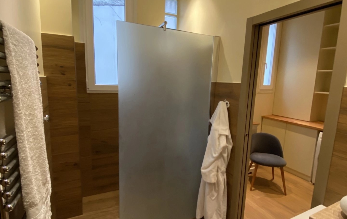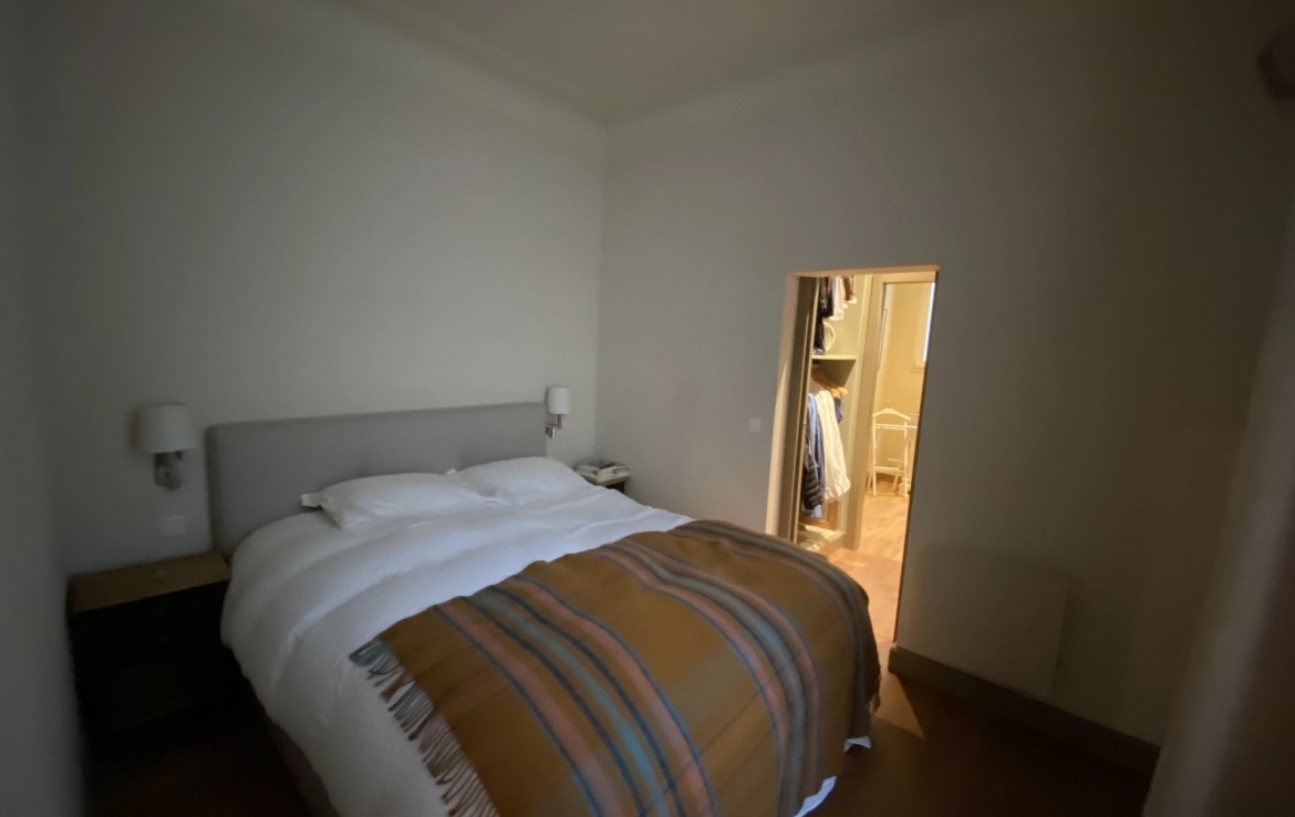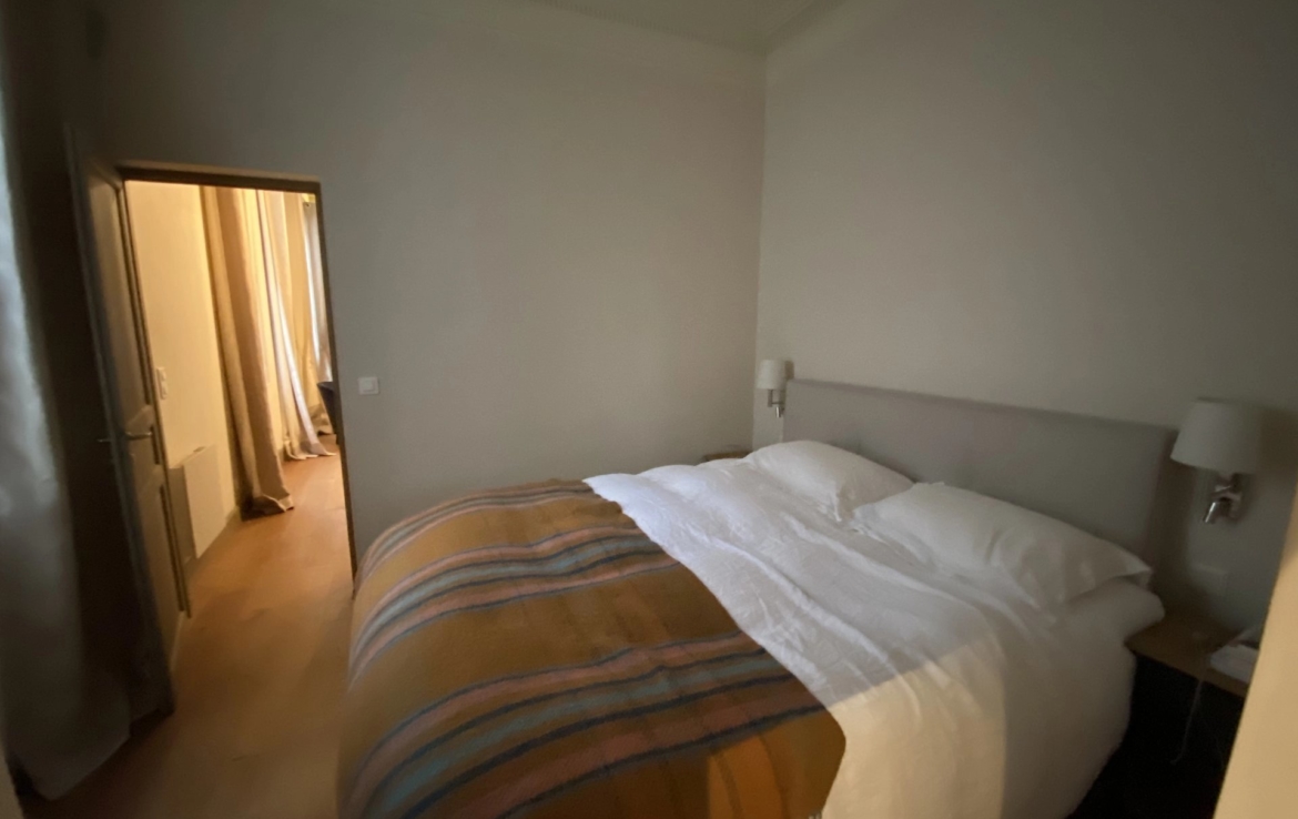 Il ne donne pas sur la place mais sur la cour intérieure et offre une grande pièce à vivre, une cuisine entièrement équipée, une chambre avec dressing et sa salle de bain attenante. Un espace buanderie complète l’aménagement de cet appartement refait à neuf.