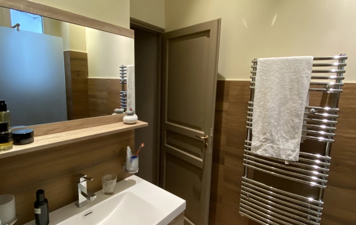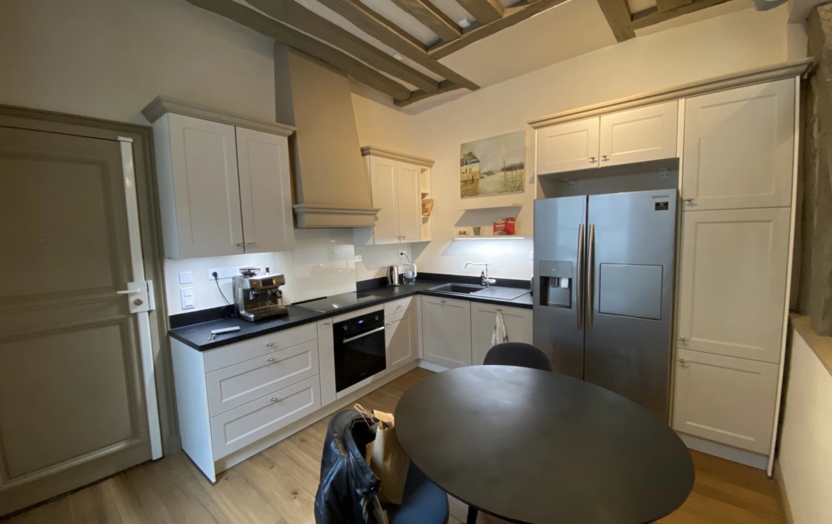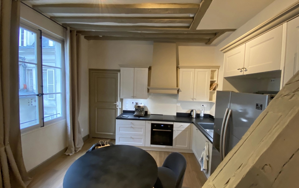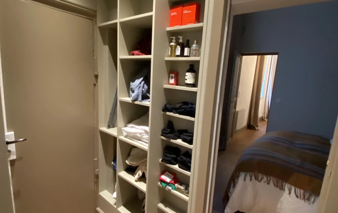Il ne donne pas sur la place mais sur la cour intérieure et offre une grande pièce à vivre, une cuisine entièrement équipée, une chambre avec dressing et sa salle de bain attenante. Un espace buanderie complète l’aménagement de cet appartement refait à neuf.