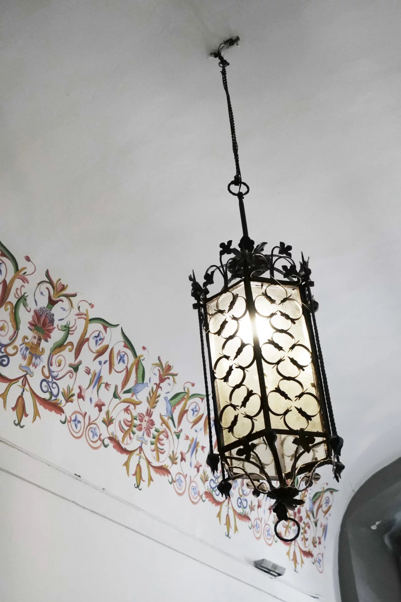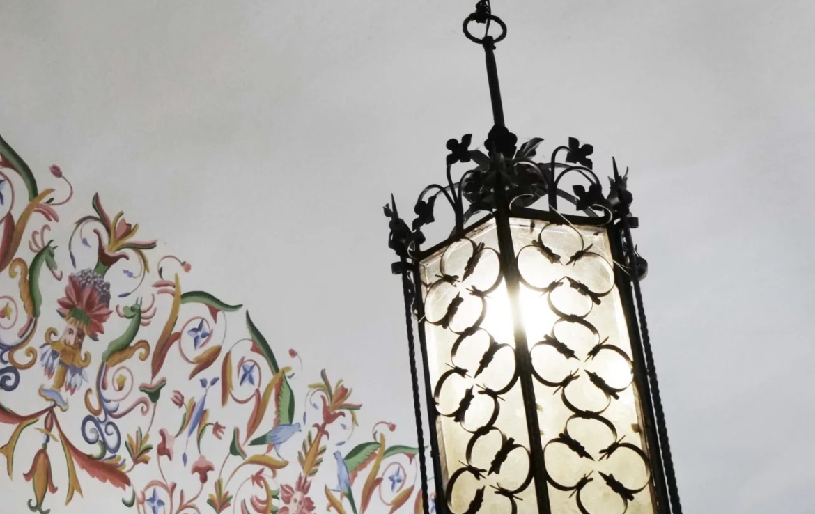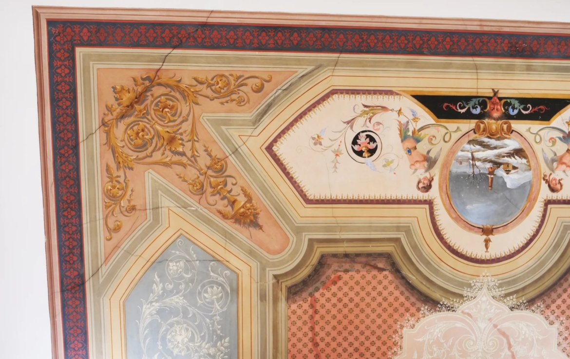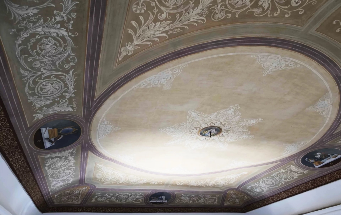 ont des hauteurs sous plafonds d’environ 5,5 mètres et sont décorées de fresques. La cuisine, avec ses colonnes en pierre caractéristiques,