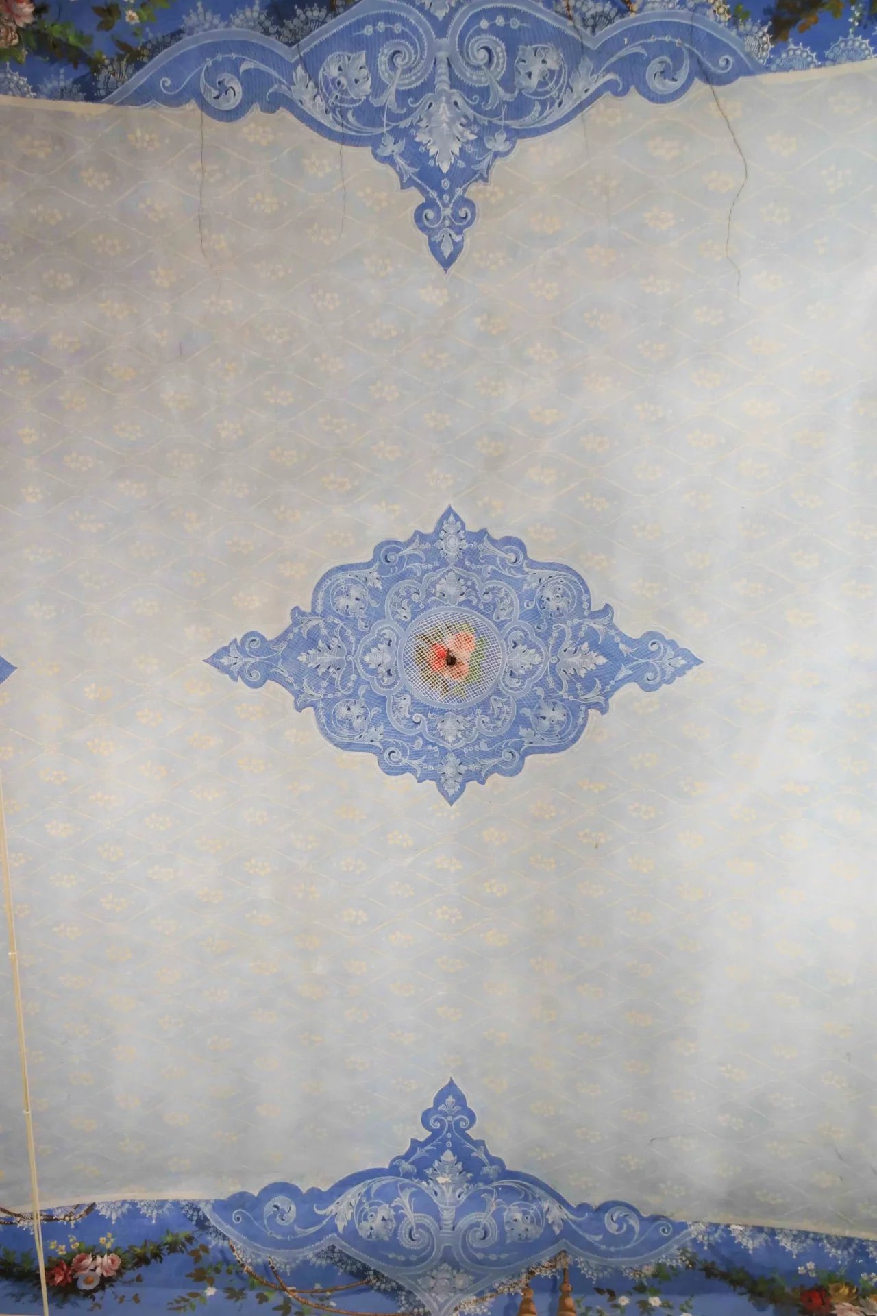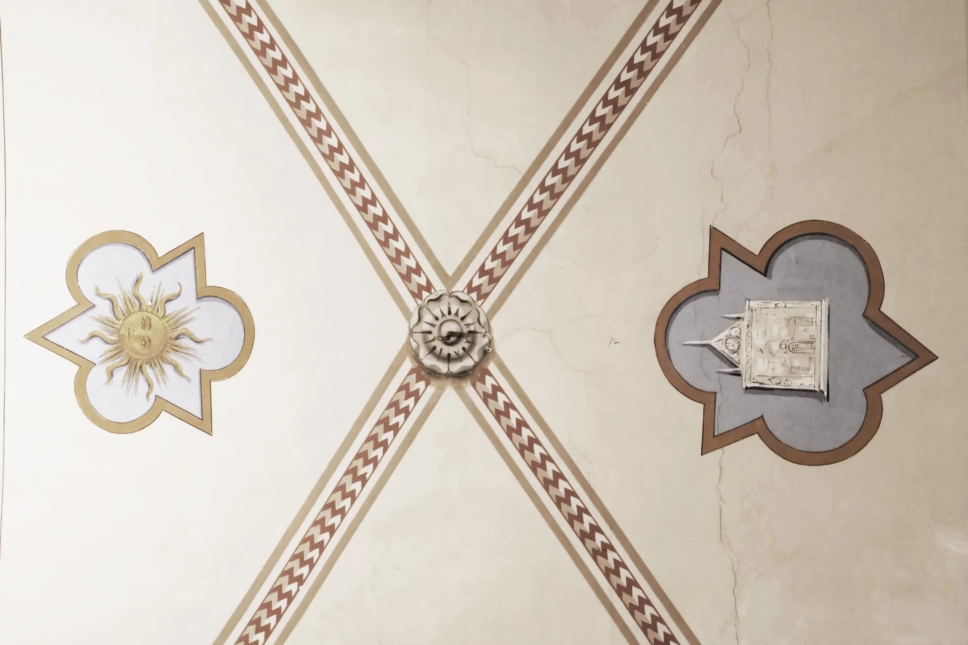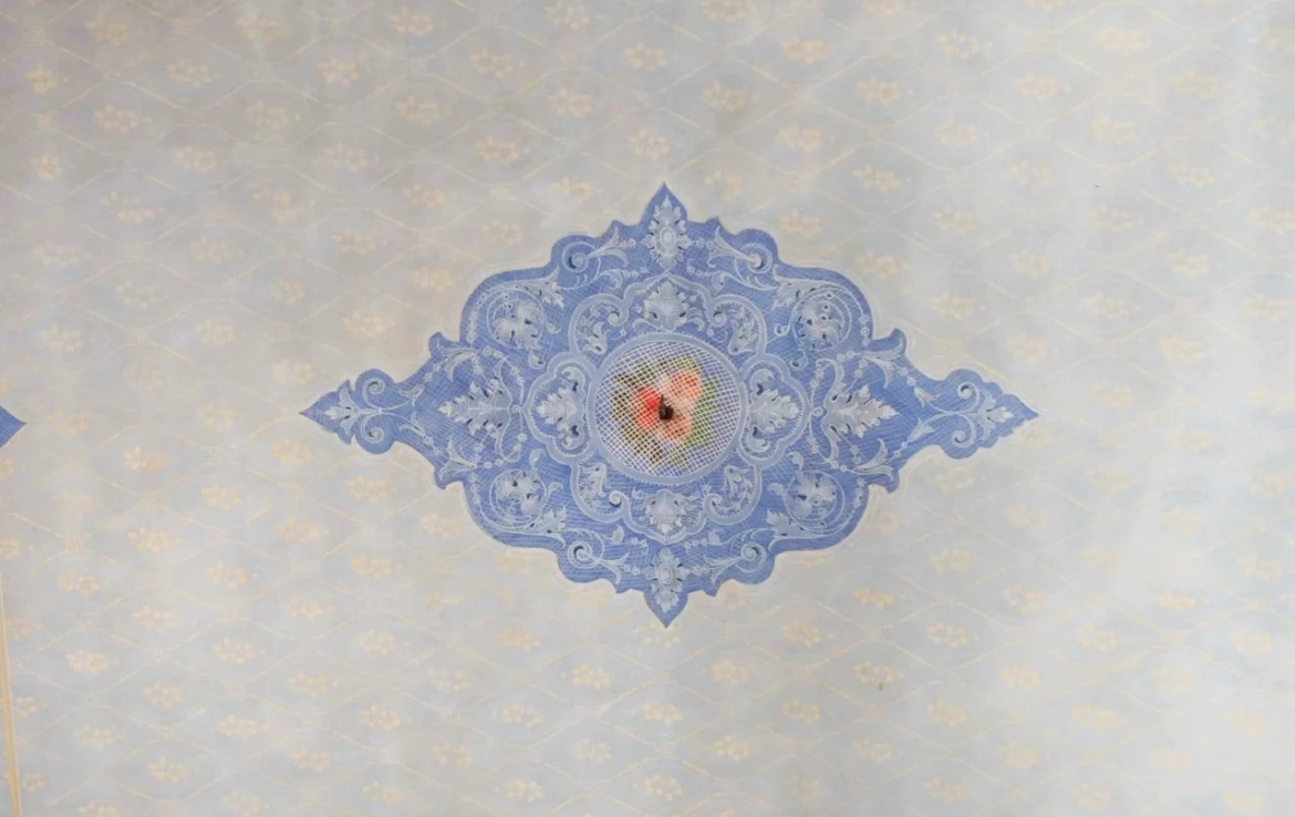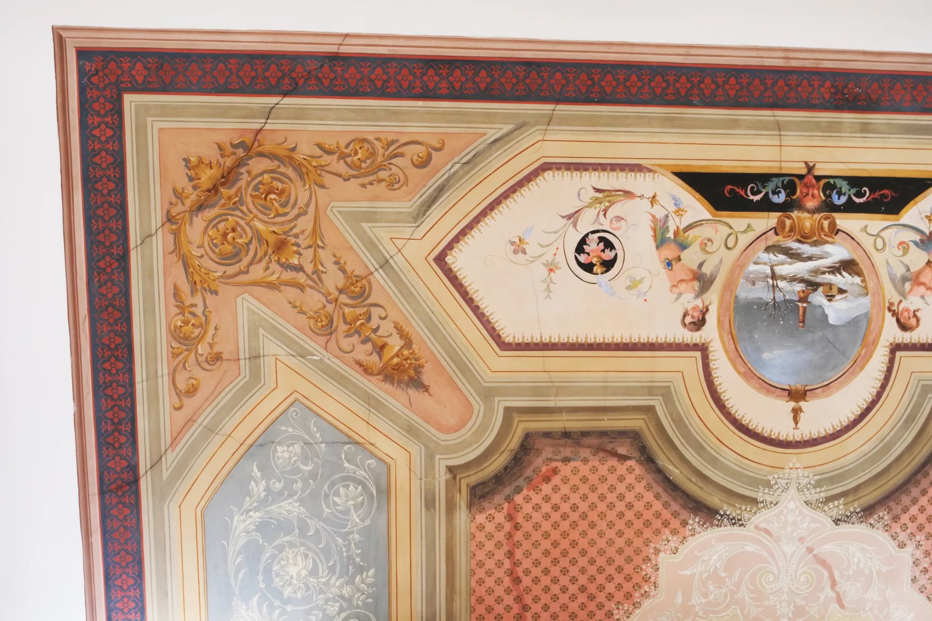 ont des hauteurs sous plafonds d’environ 5,5 mètres et sont décorées de fresques. La cuisine, avec ses colonnes en pierre caractéristiques,