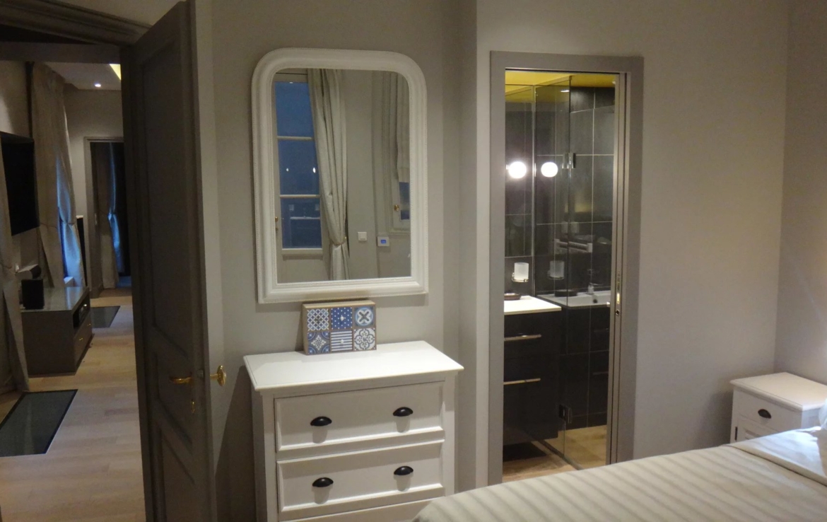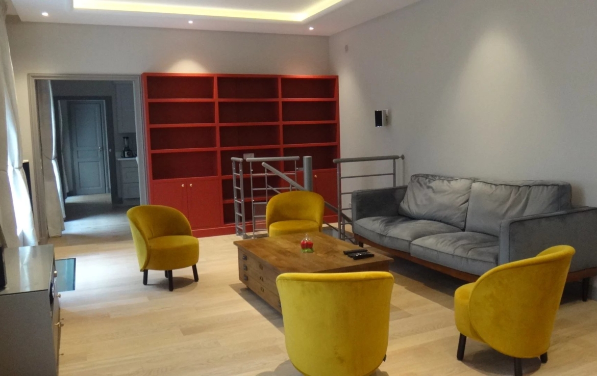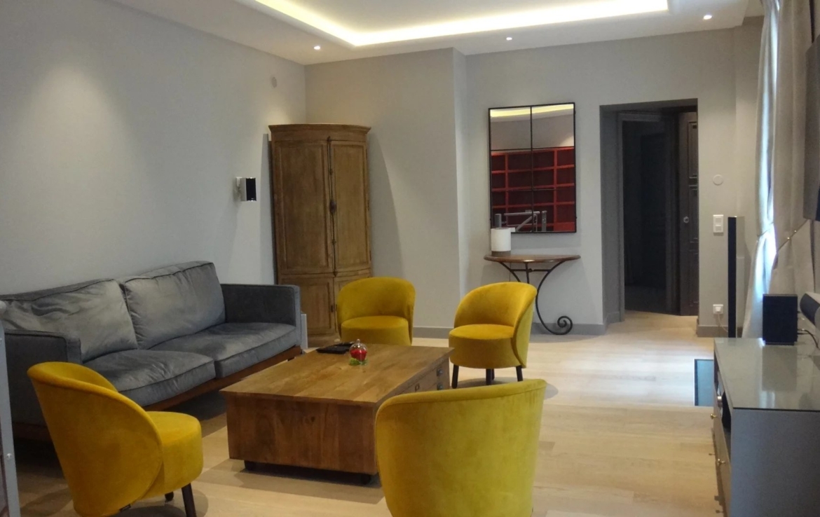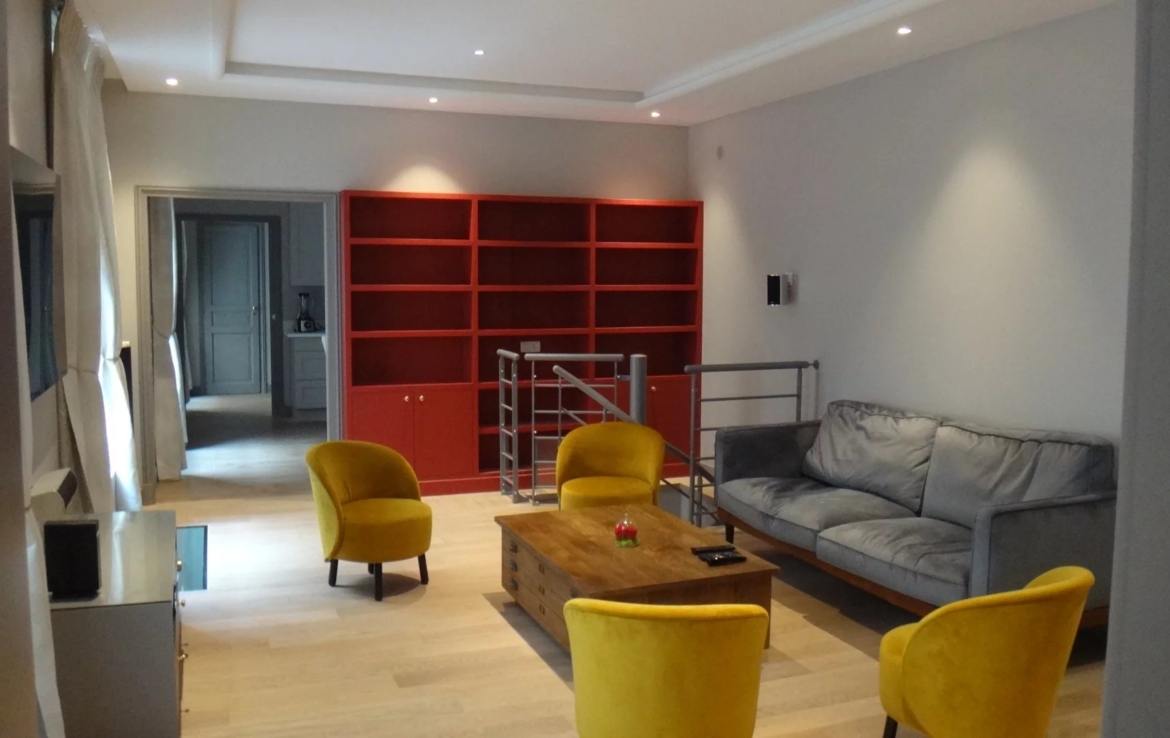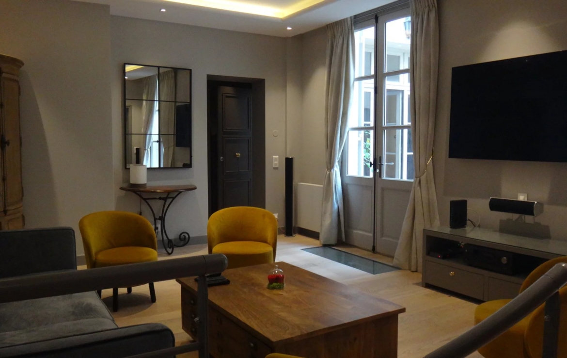 Place des Vosges, plein sud et ensoleillé appartement en très bon état de 97.65m² carrez, au rez de chaussée sur cour pavée. Il comprend une entrée, une chambre avec sa salle d’eau et wc indépendants 7.80m² , un salon avec deux portes fenêtres, une grande cuisine, une petite chambre avec salle d’eau et wc indépendants. En souplex et par un escalier, un espace de vie avec des puits de lumière, avec sa salle d’eau et ses wc, une buanderie et une cave à vin.