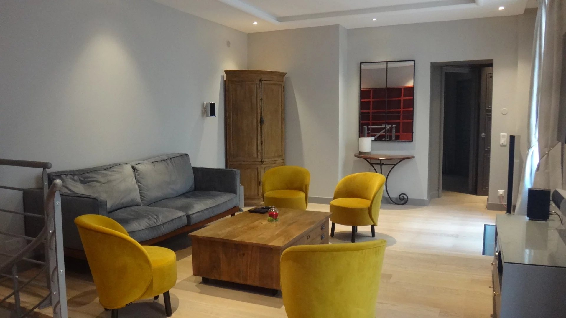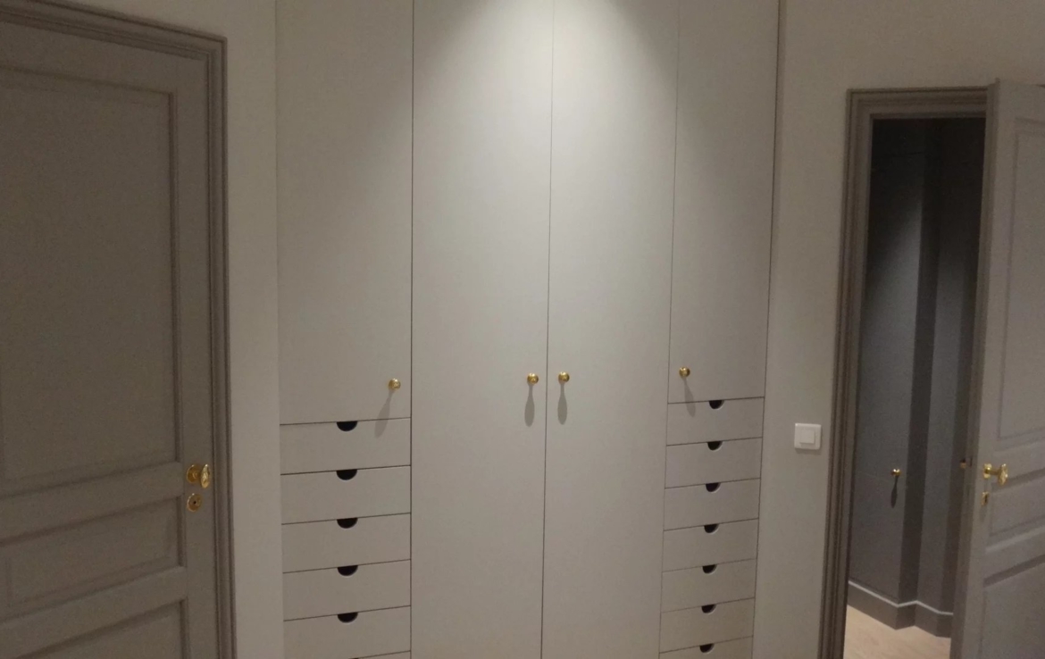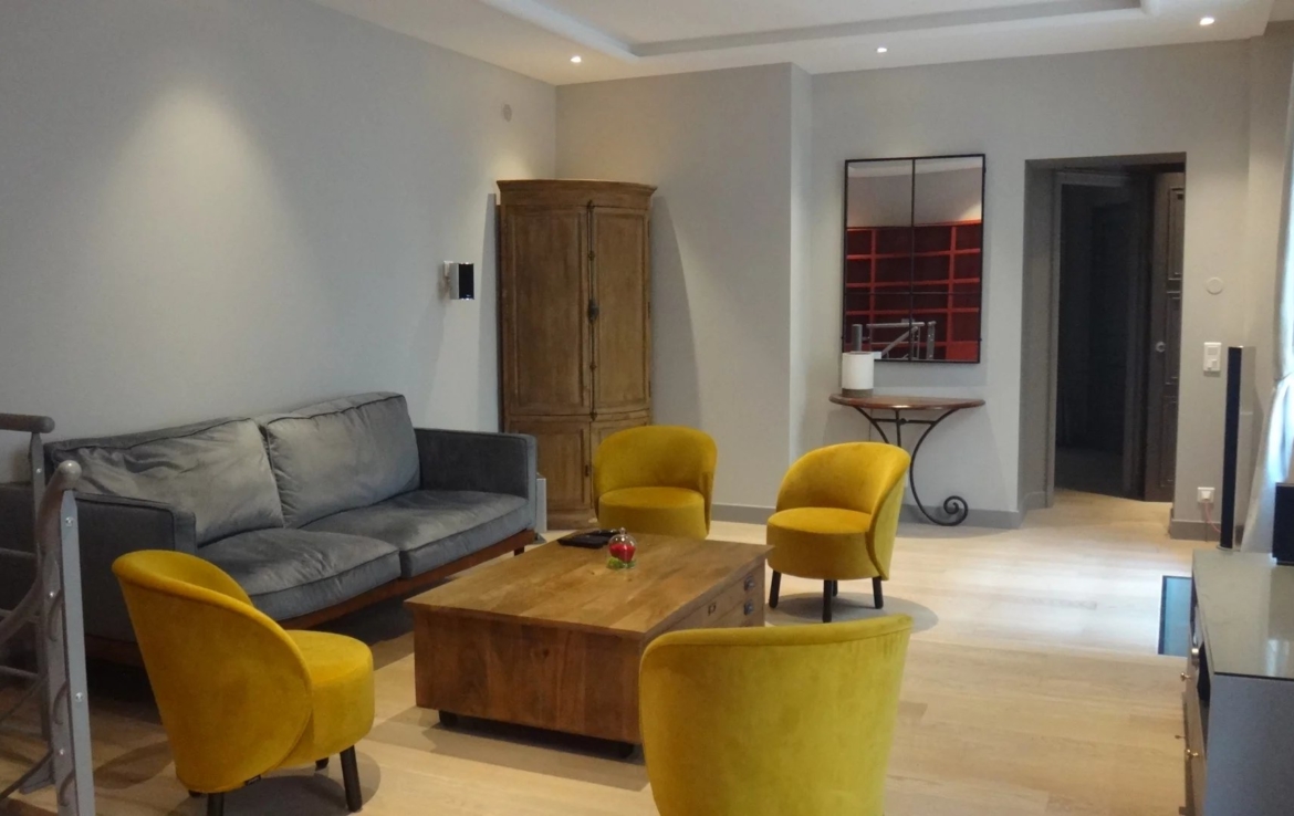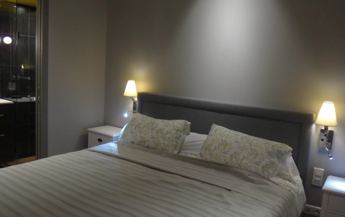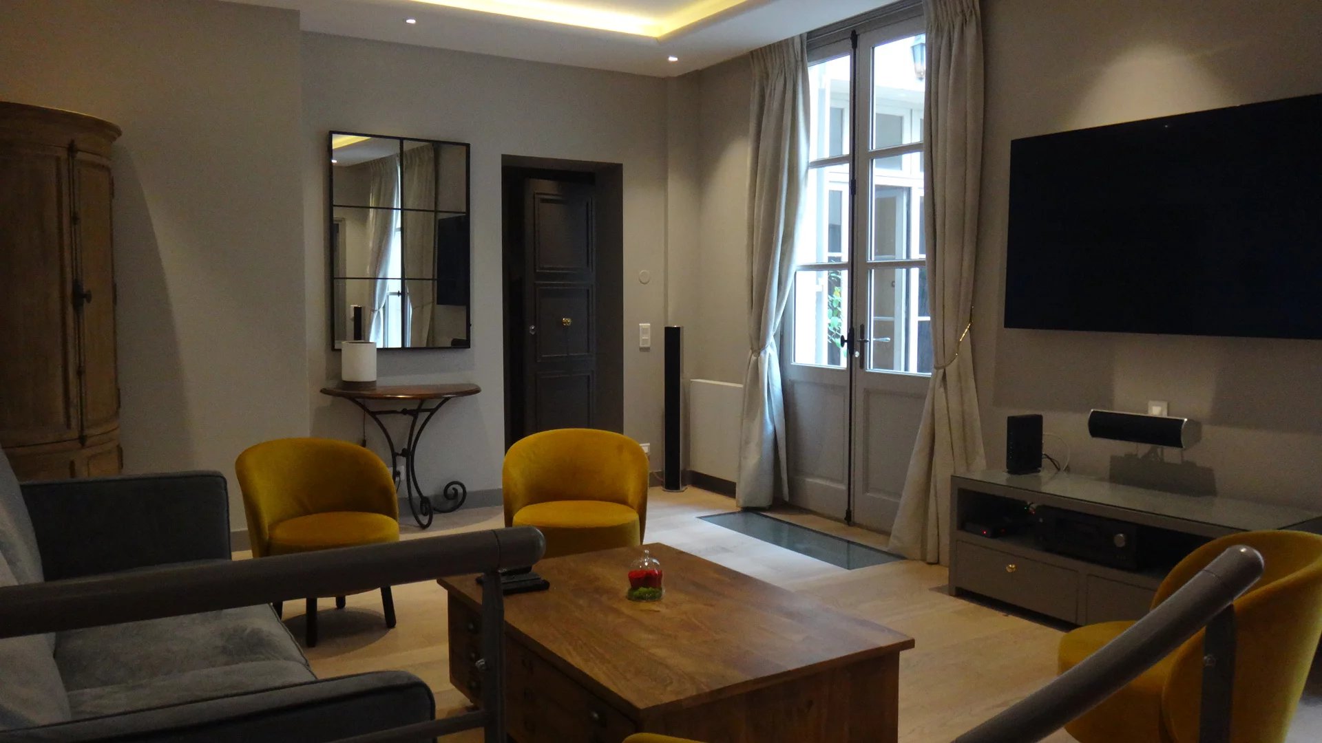 Place des Vosges, plein sud et ensoleillé appartement en très bon état de 97.65m² carrez, au rez de chaussée sur cour pavée. Il comprend une entrée, une chambre avec sa salle d’eau et wc indépendants 7.80m² , un salon avec deux portes fenêtres, une grande cuisine, une petite chambre avec salle d’eau et wc indépendants. En souplex et par un escalier, un espace de vie avec des puits de lumière, avec sa salle d’eau et ses wc, une buanderie et une cave à vin.