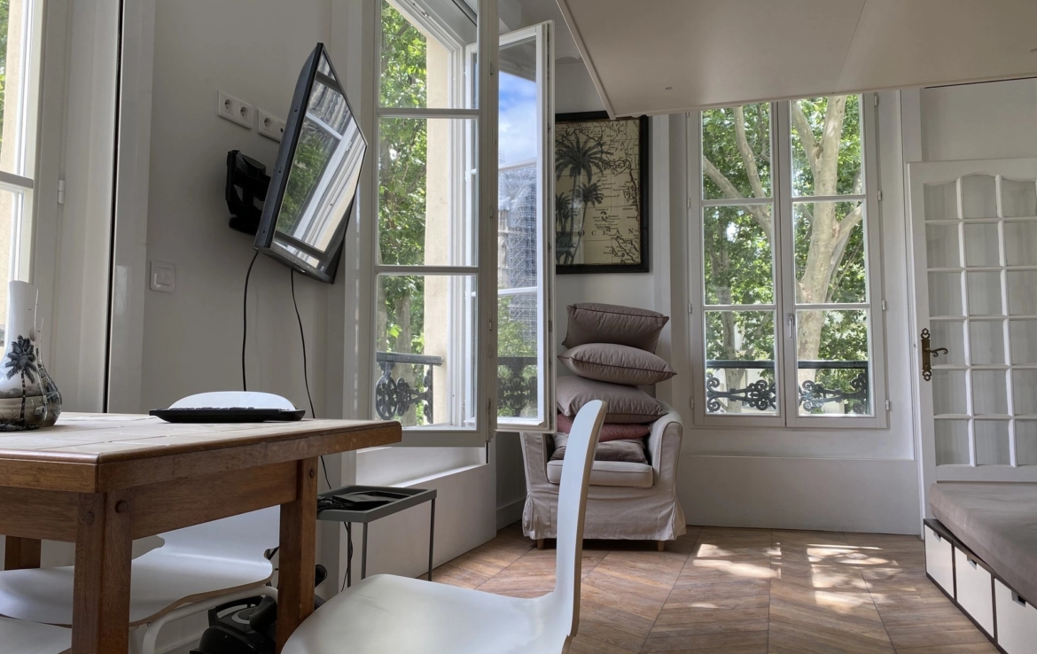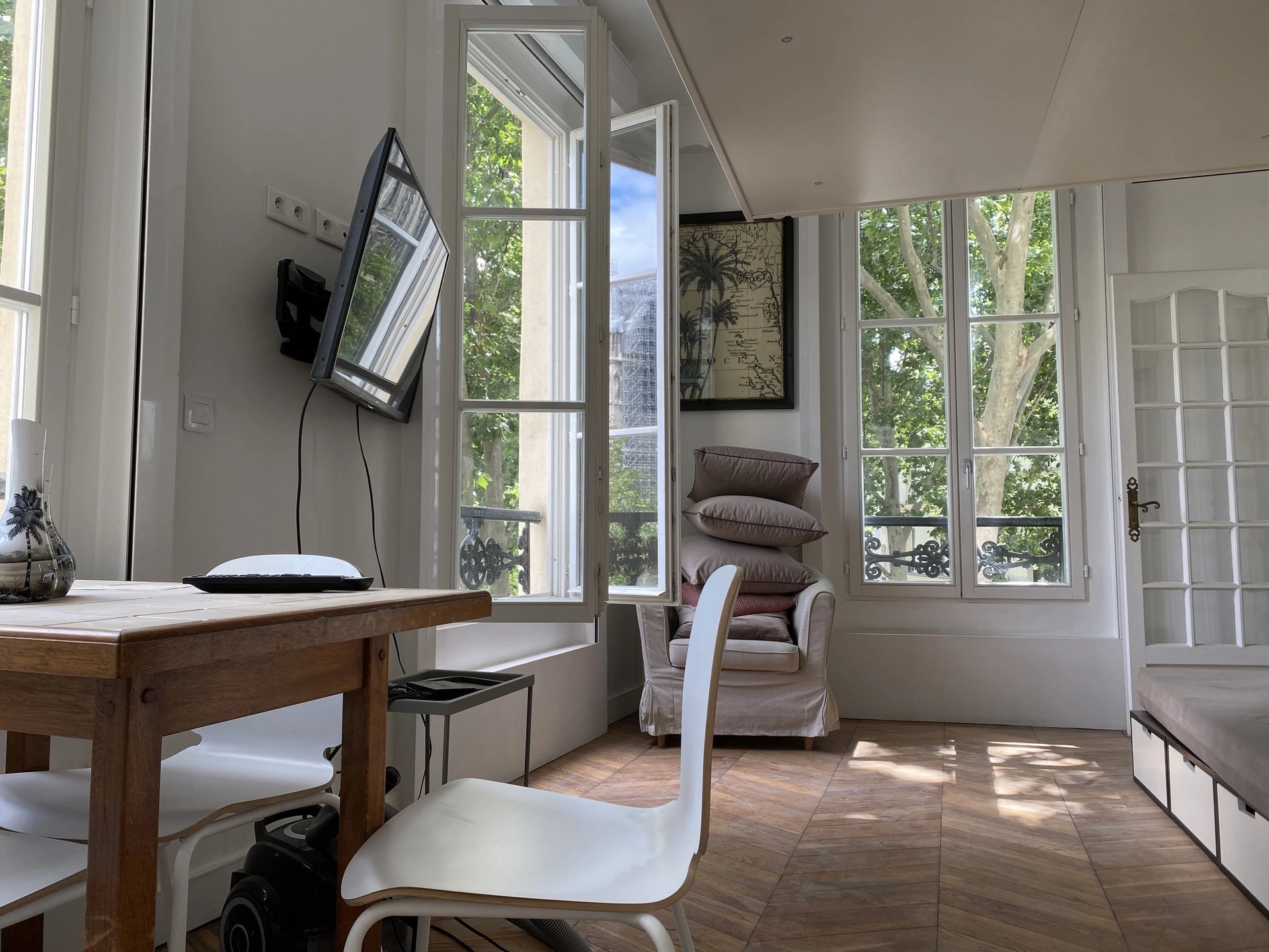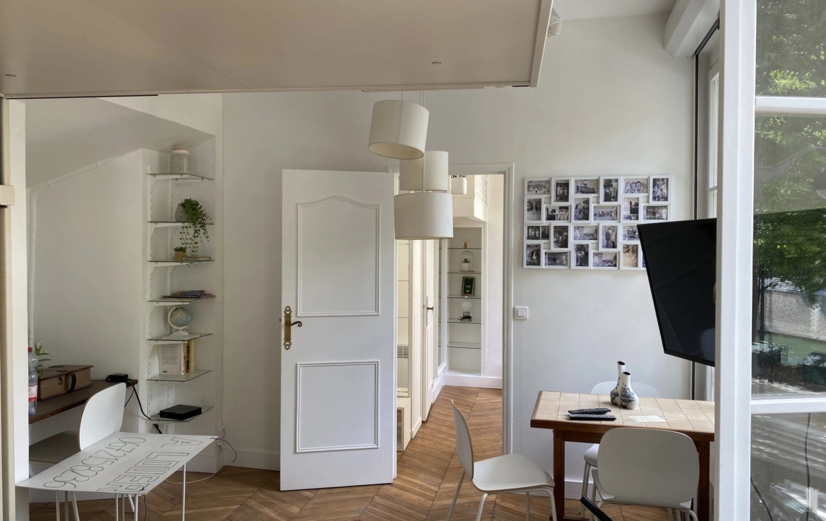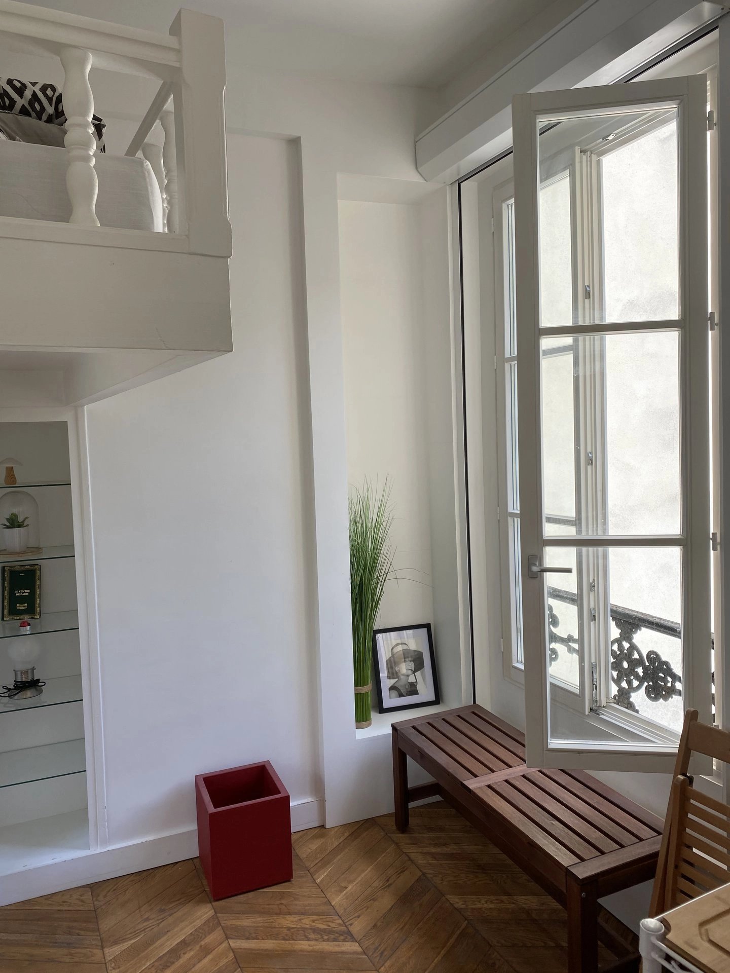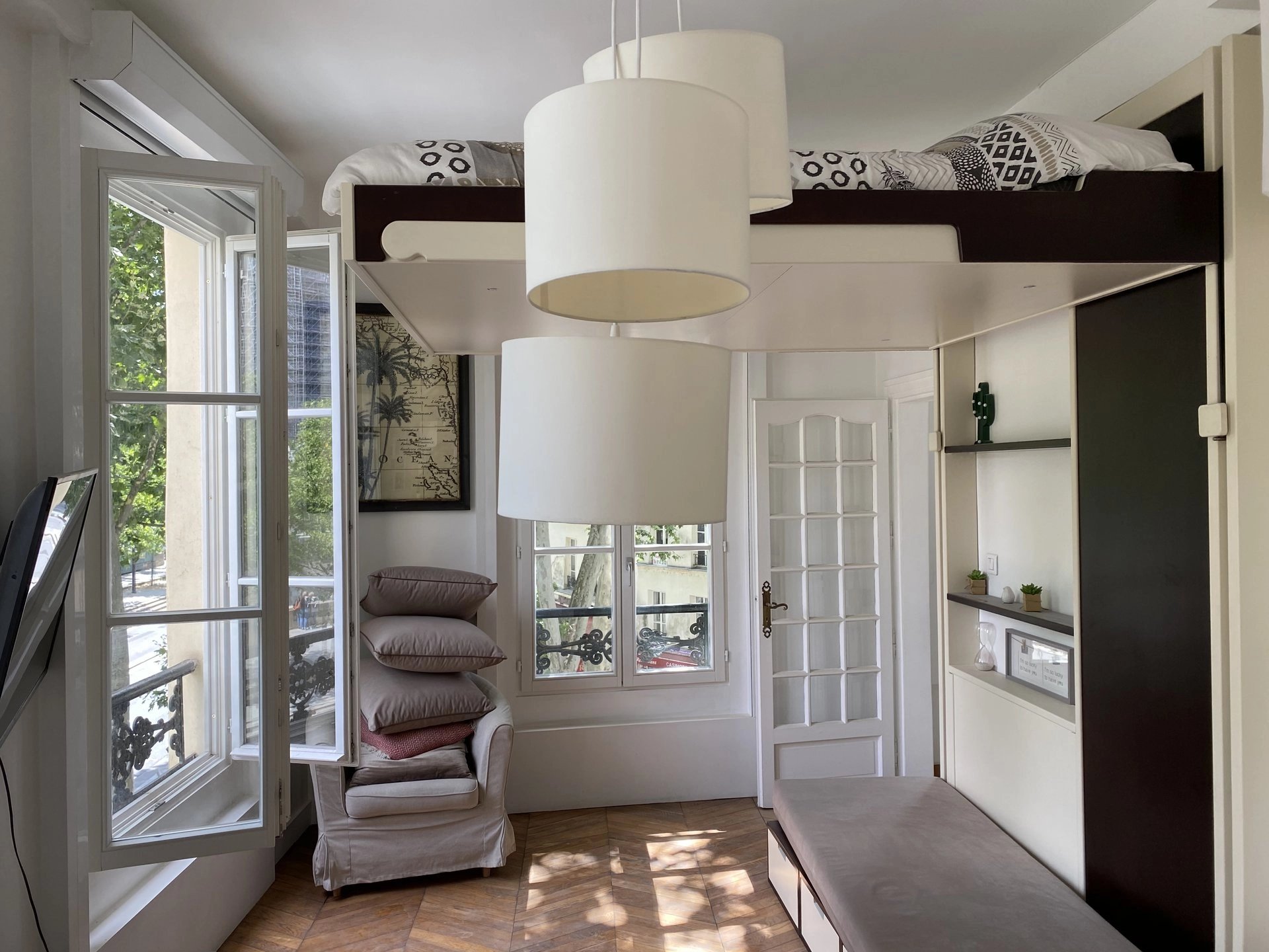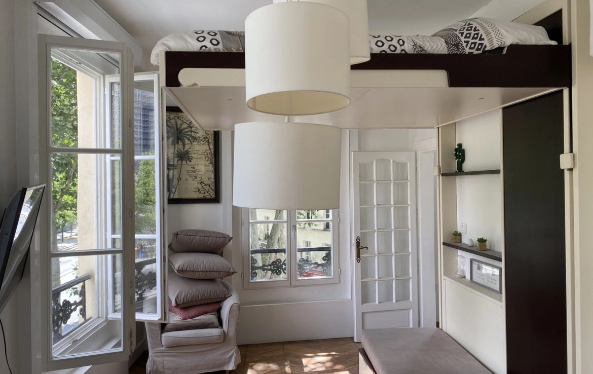 Appartement de 35 m2 au 3ème étage sans ascenseur. Il est très clair et bénéficie d’une vue sur la seine et sur Notre Dame. Il offre deux pièces dont une chambre avec mezzanine et une pièce de vie avec la possibilité d’un couchage supplémentaire pour deux personnes (lit escamotable par verrons hydrauliques au plafond).